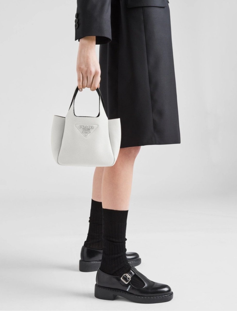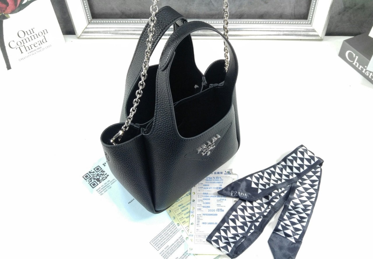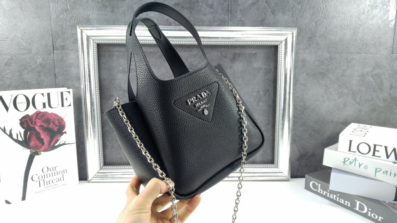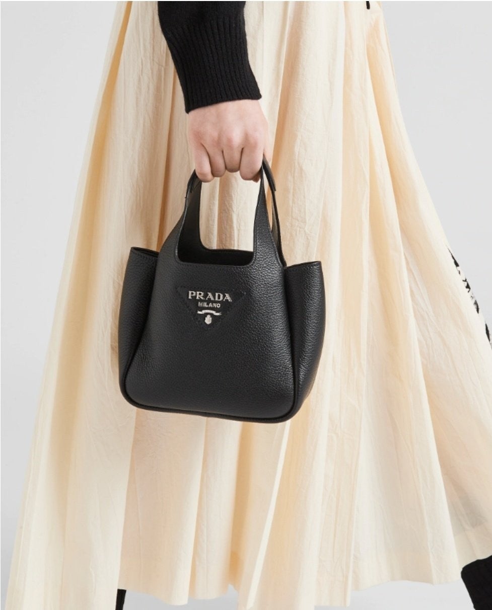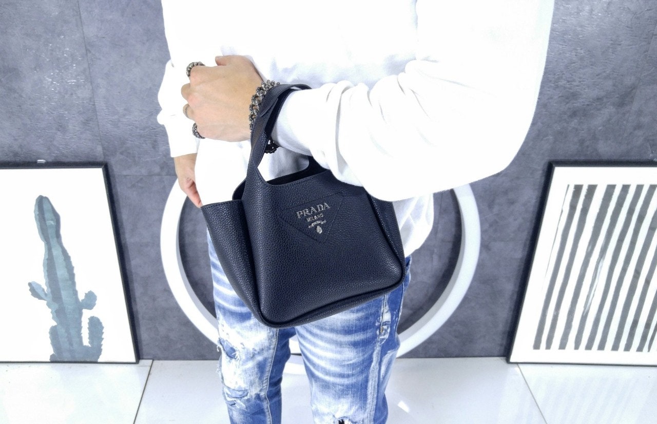 리버스 스티칭이 부드럽고 둥근 실루엣을 강조하는 핸드백입니다. 스티칭으로 트라이앵글을 새롭게 표현하여 아이템을 장식했으며, 중앙에는 프☆다 메탈 레터링 로고가 반짝입니다.