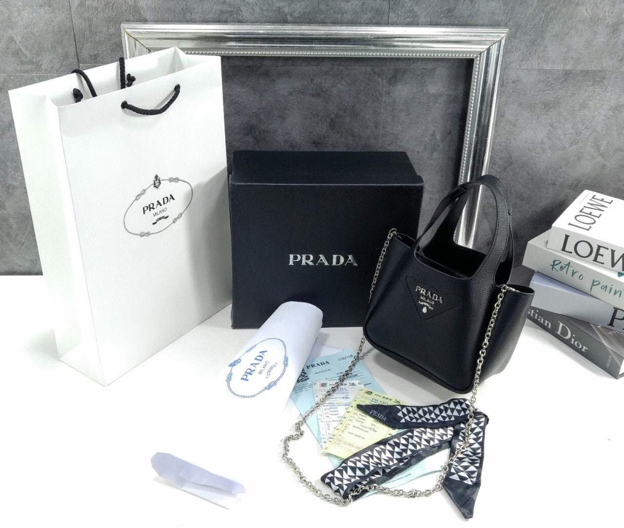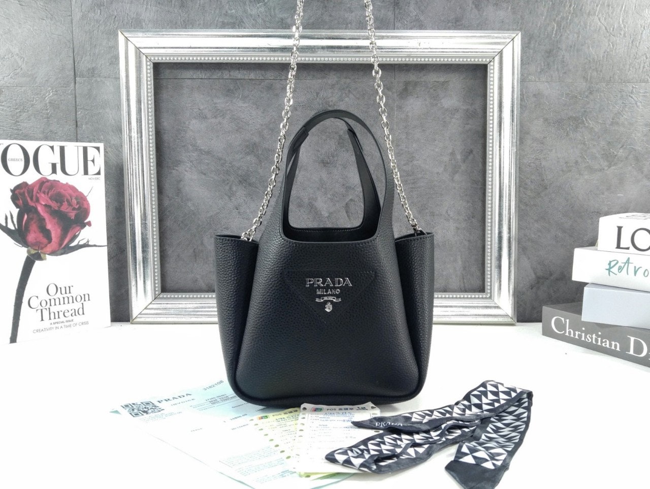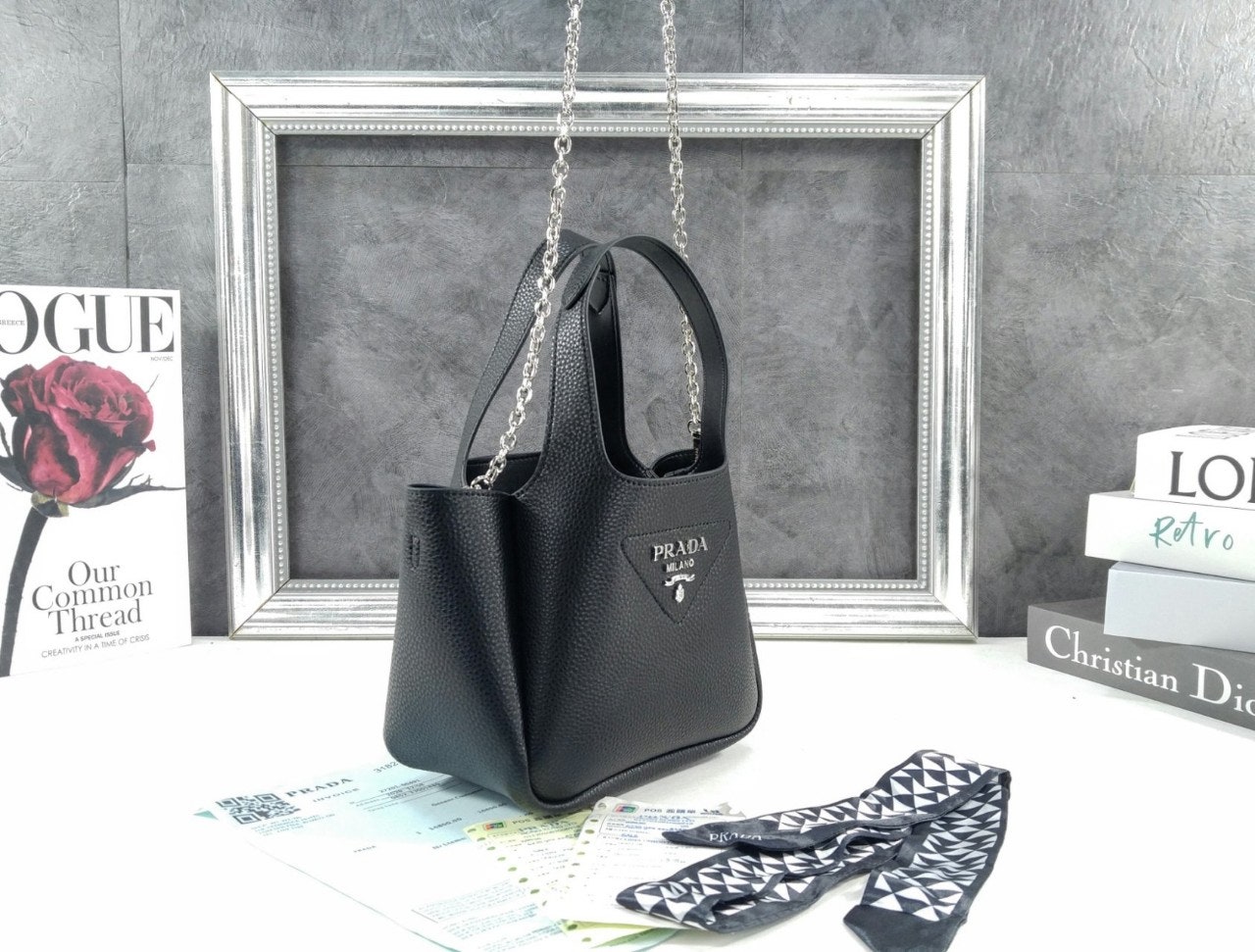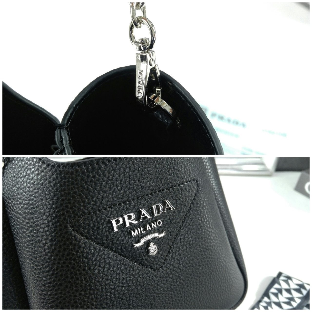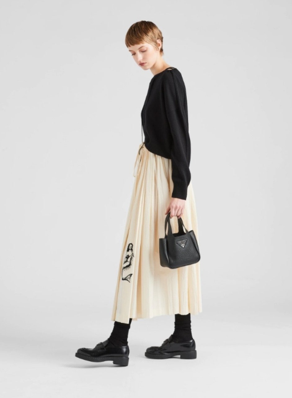 리버스 스티칭이 부드럽고 둥근 실루엣을 강조하는 핸드백입니다. 스티칭으로 트라이앵글을 새롭게 표현하여 아이템을 장식했으며, 중앙에는 프☆다 메탈 레터링 로고가 반짝입니다.