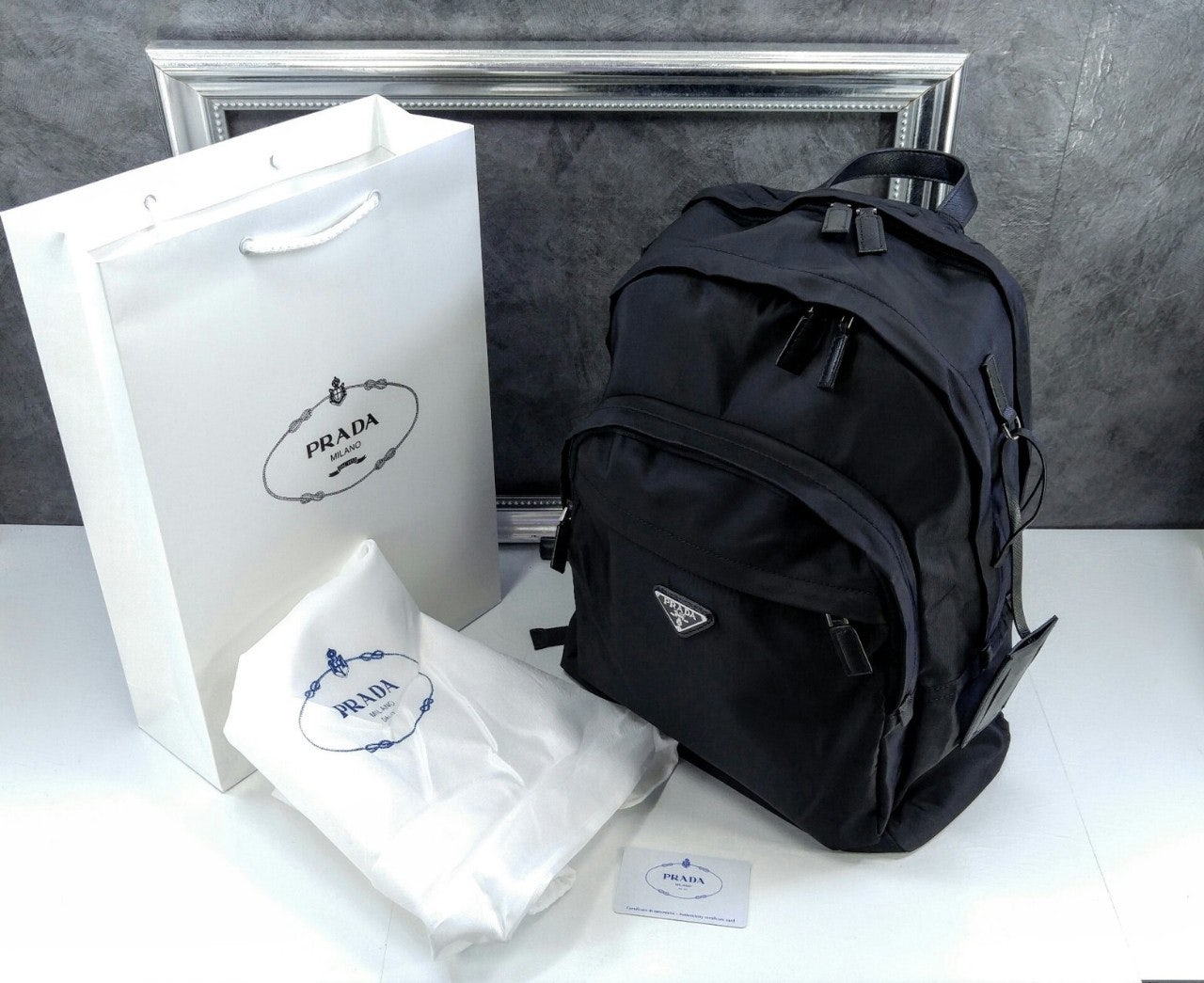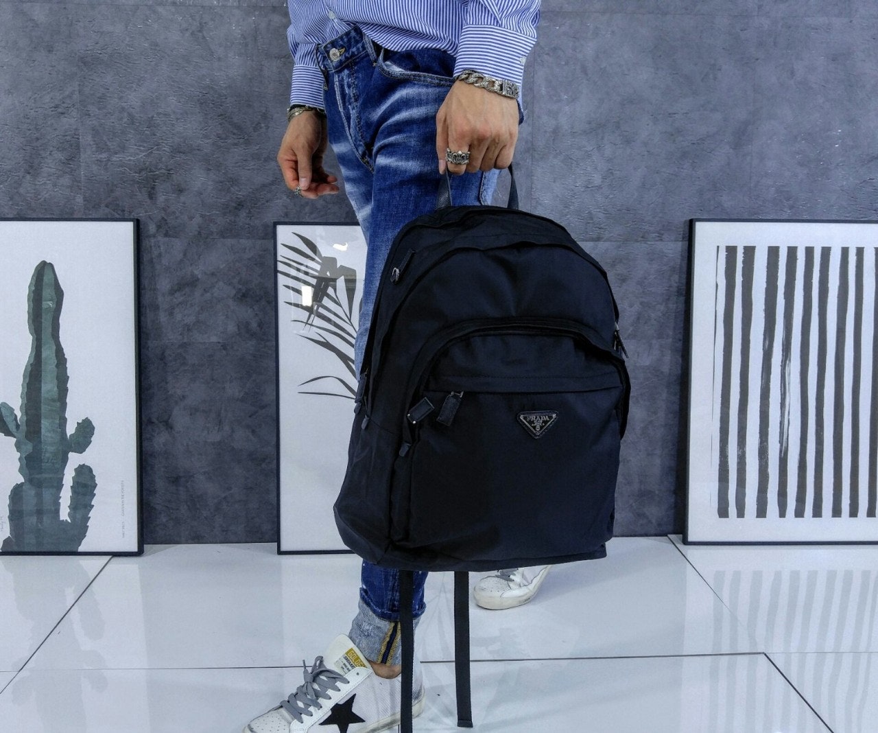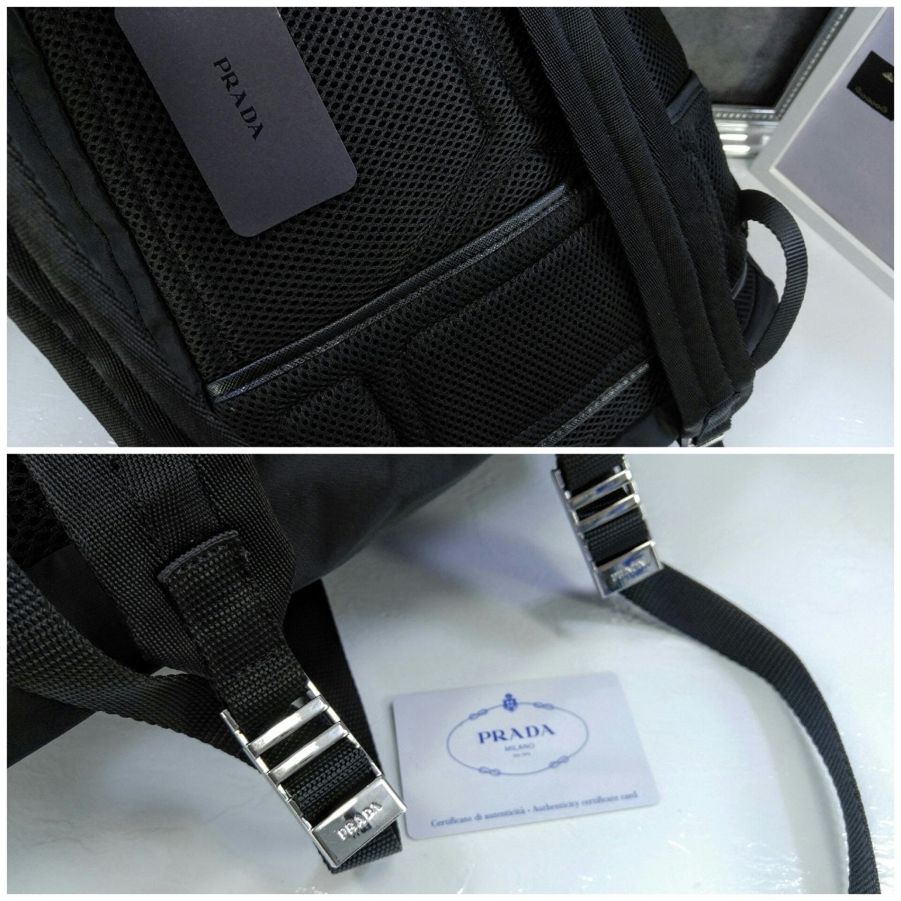 트리밍 및 핸들조절형 나일론 숄더 스트랩패딩이 들어간 기능성 소재 후면유광 스틸 마감 메탈 하드웨어측면에 유광 스틸 마감 메탈 D링지퍼 클로저가 달린 메인 수납공간전면에 지퍼식 외부 포켓나일론 라이닝내부 로고 태그전면 외부에 에나멜 트라이앵글 로고후면에 트롤리용 밴드