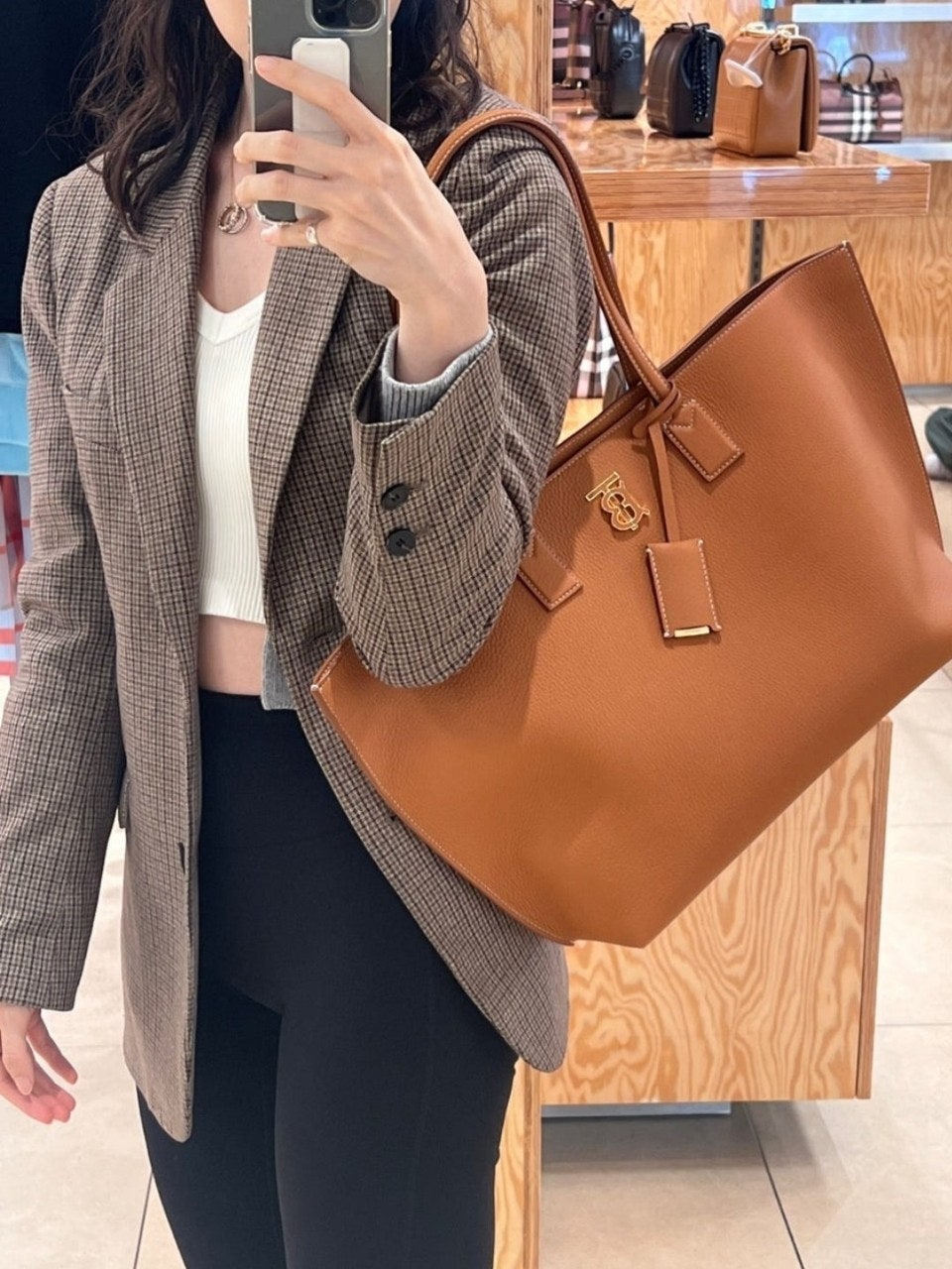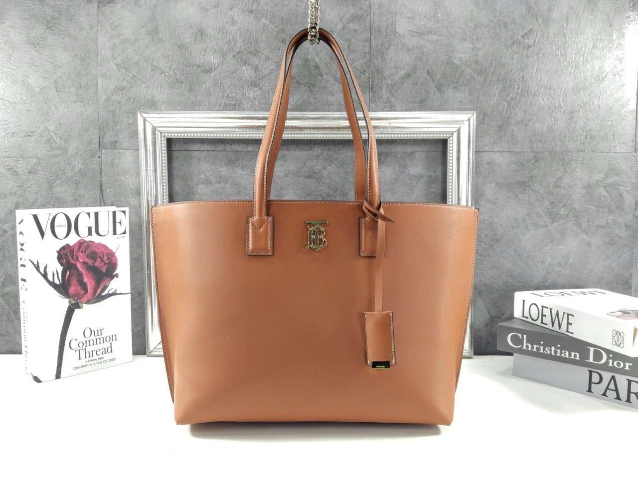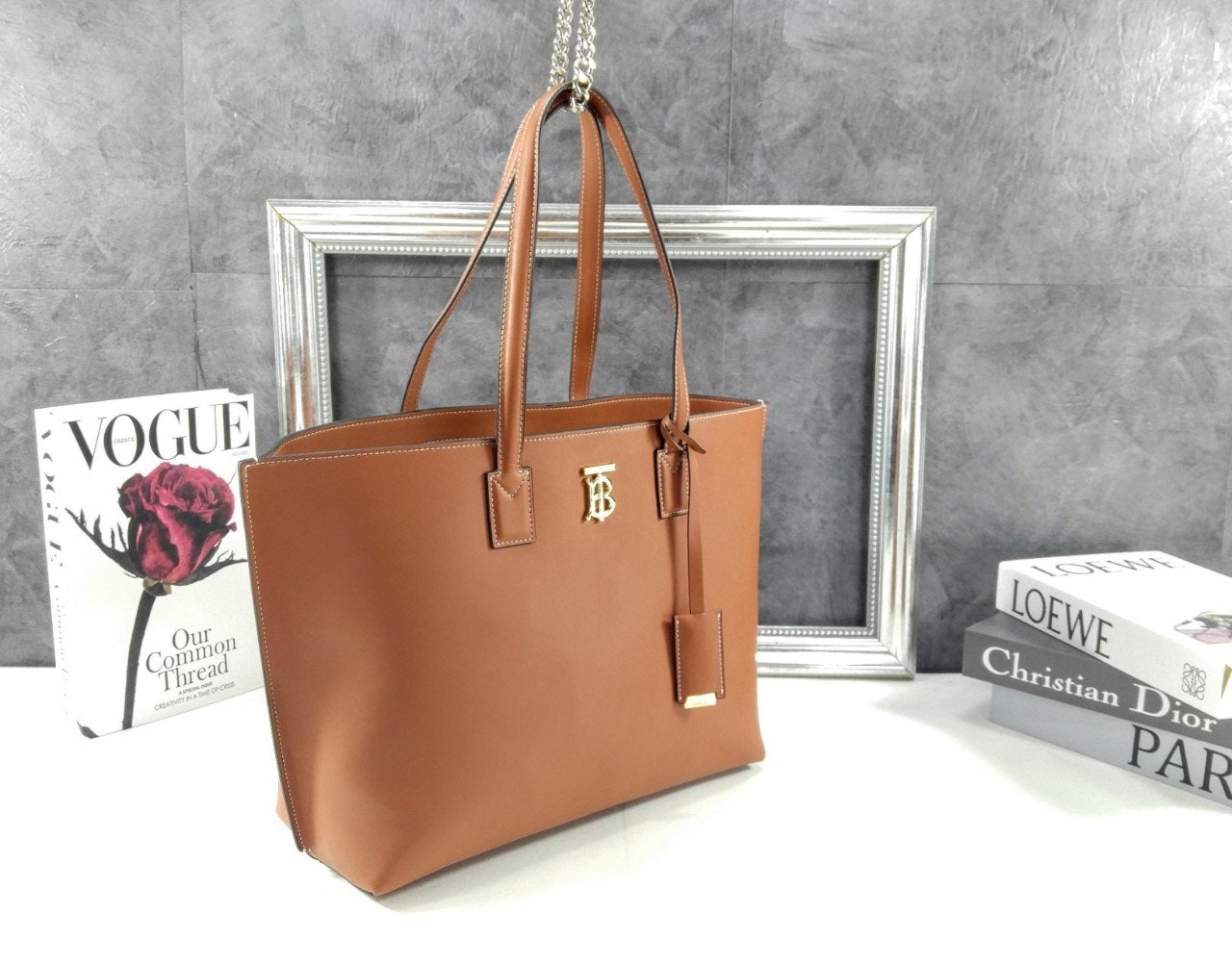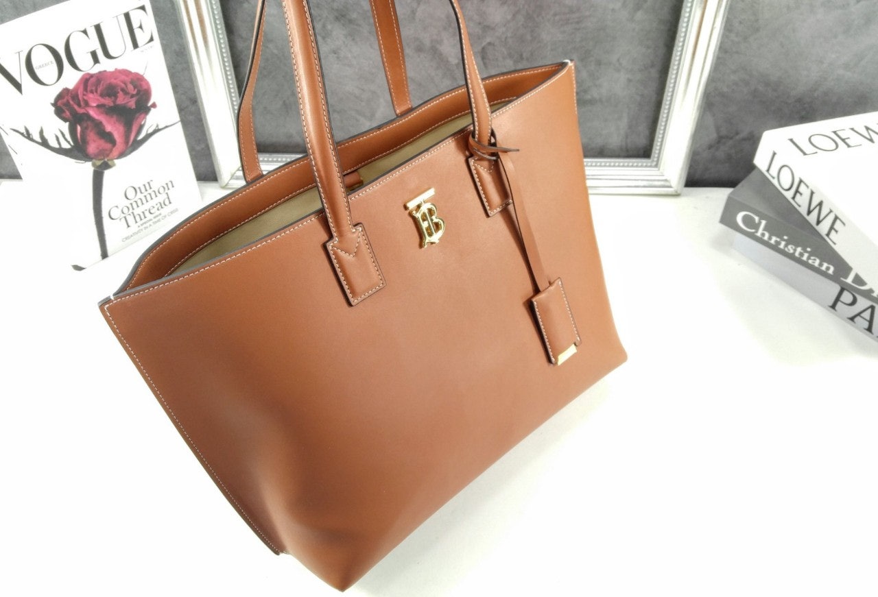 버☆리 브라운 '모노그램 미디엄' 쇼퍼백. 송아지 가죽으로 제작되었으며, 랍스터 클래스프 잠금장치로 고정됩니다.