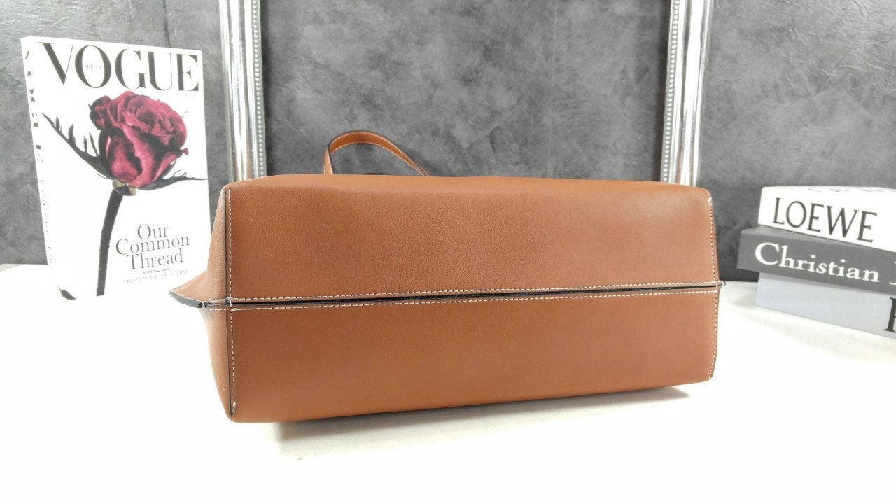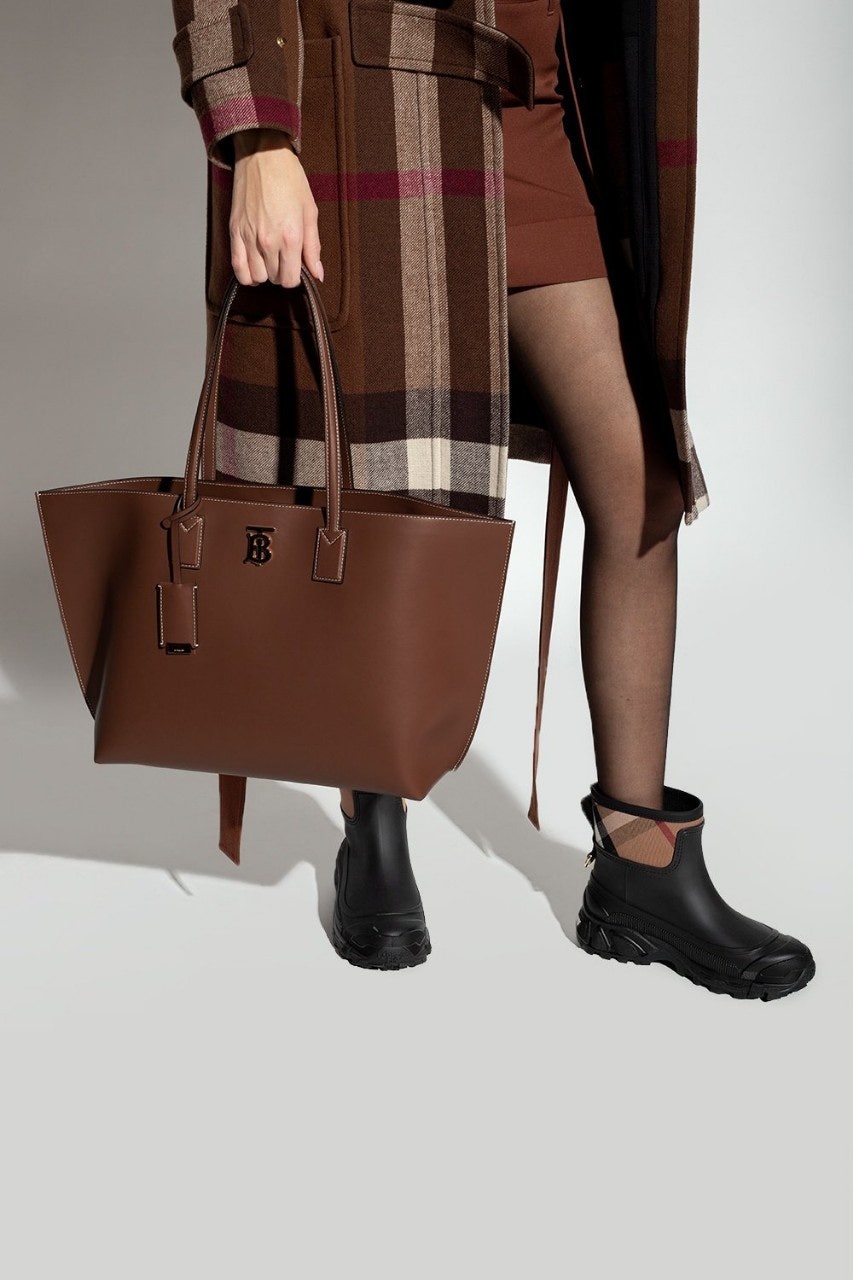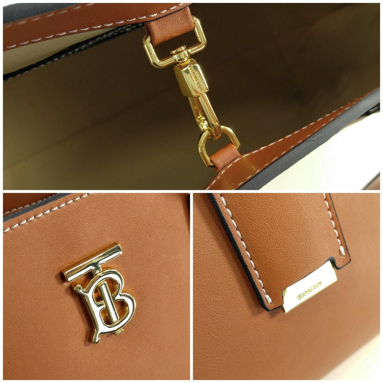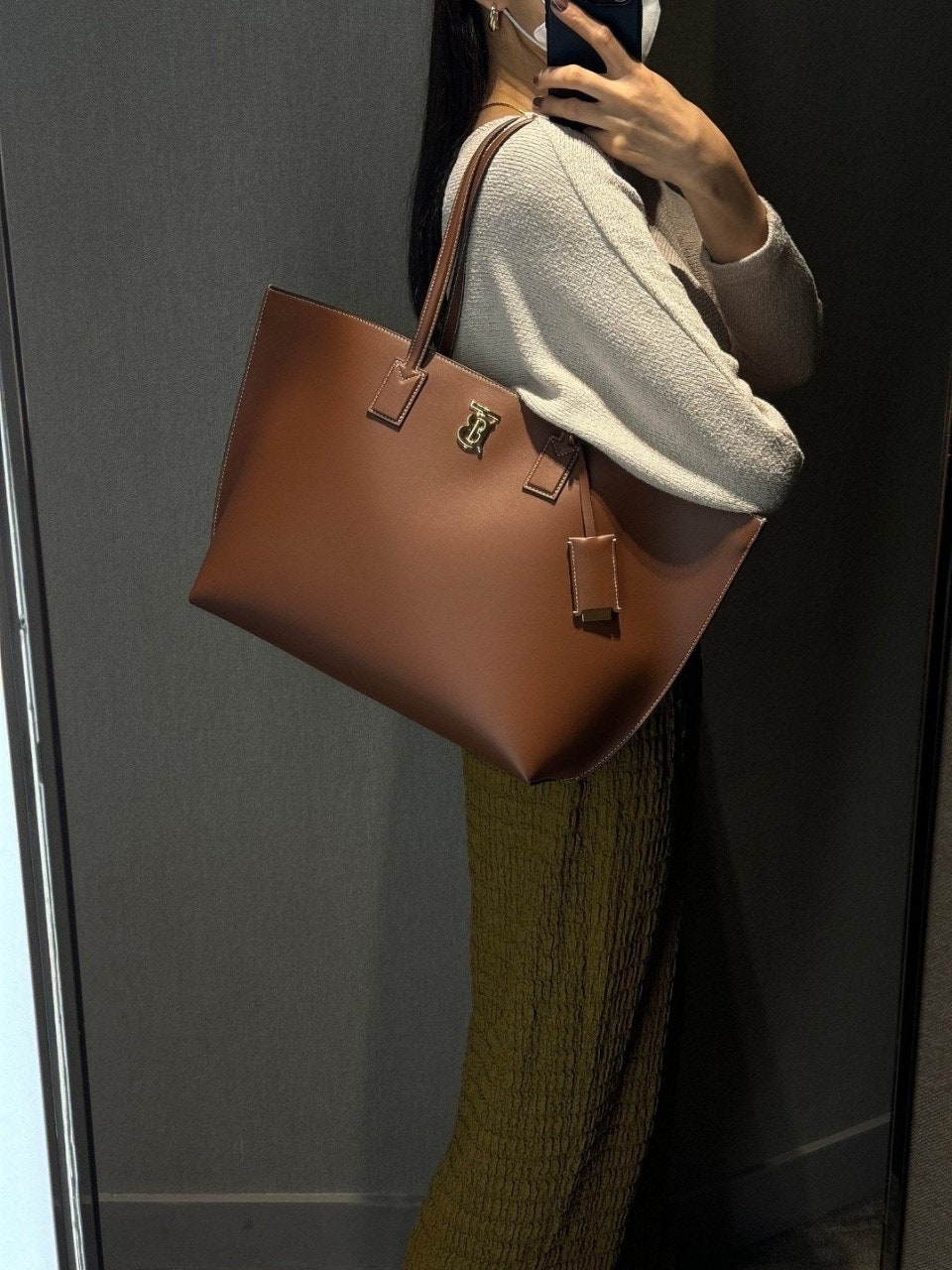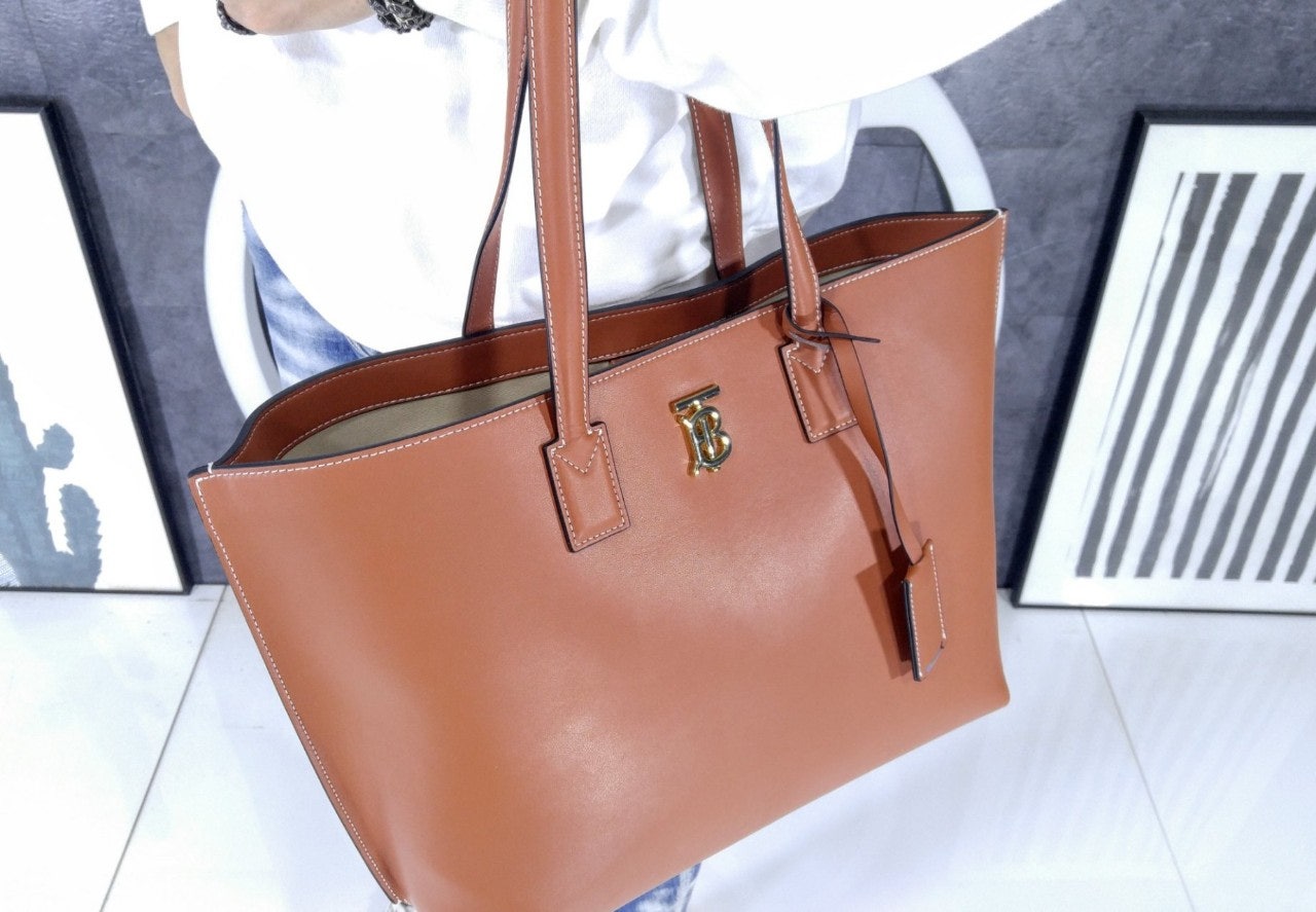 버☆리 브라운 '모노그램 미디엄' 쇼퍼백. 송아지 가죽으로 제작되었으며, 랍스터 클래스프 잠금장치로 고정됩니다.