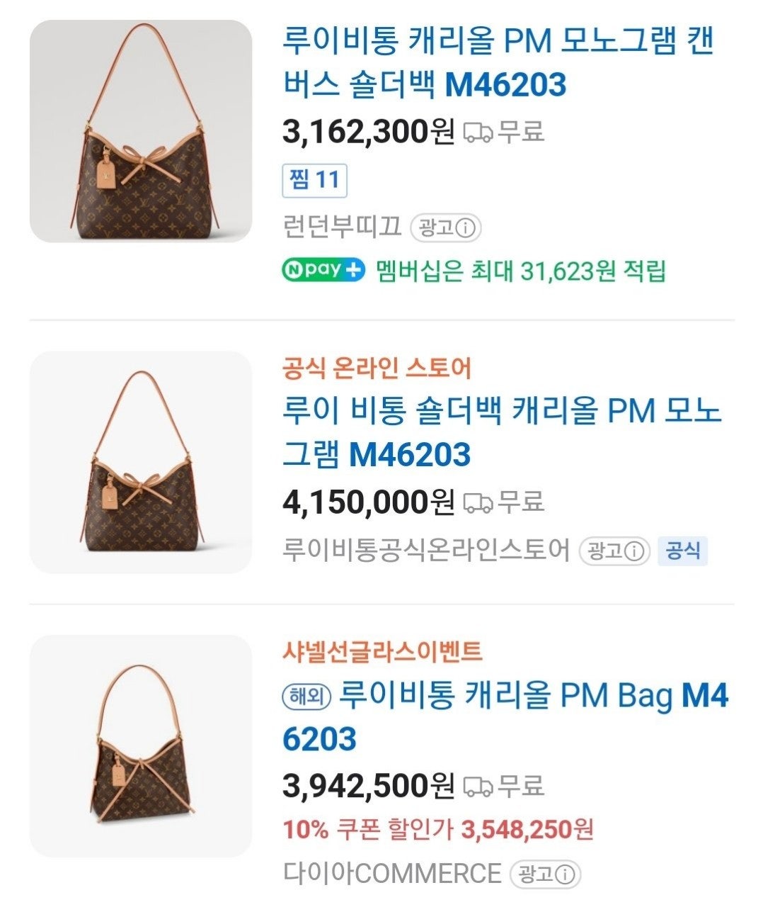 루☆비통 캐리올 PM 모노그램 캔버스 숄더백 M46203