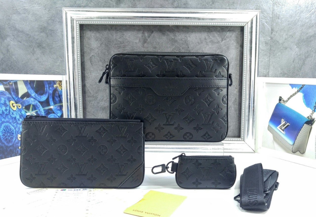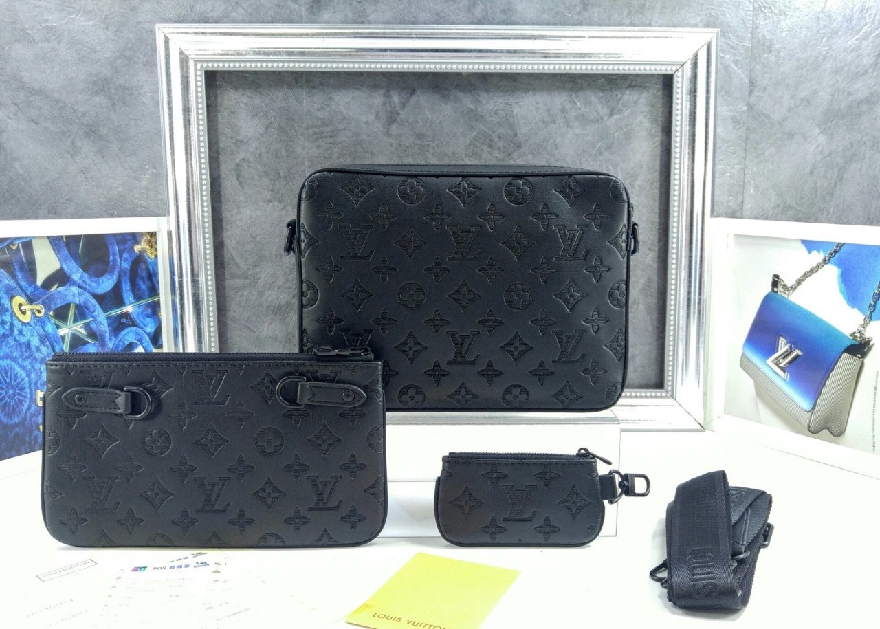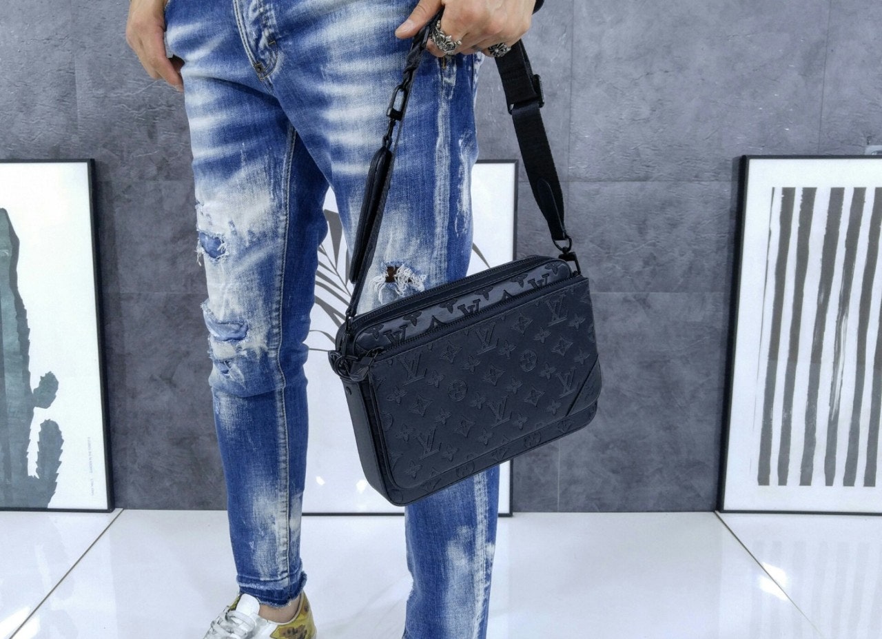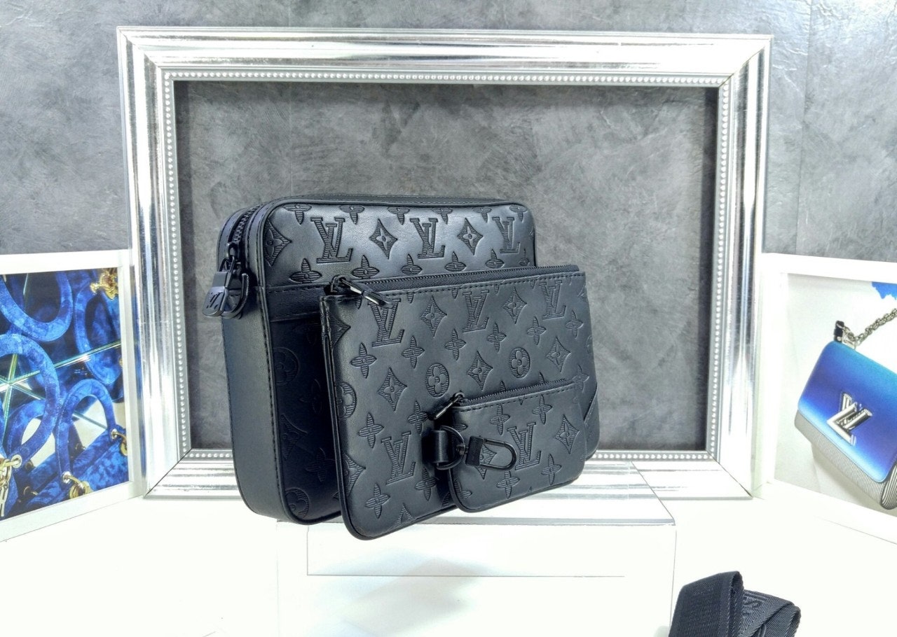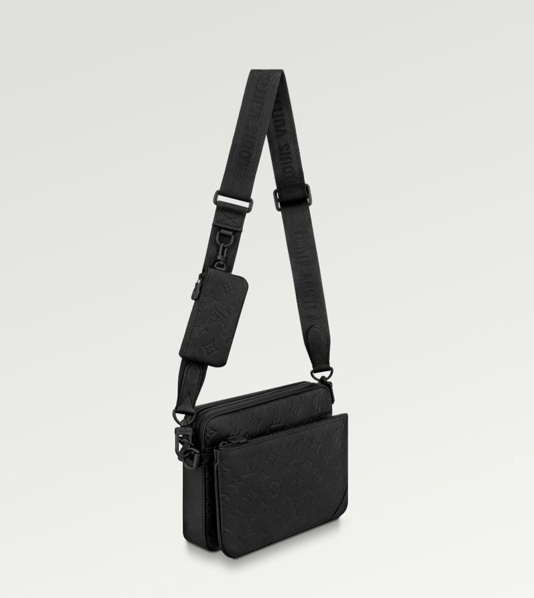 모노그램을 양각으로 새긴 송아지 가죽 소재의 트리오 메신저. 스타일리시한 하이브리드 백. 메인 수납 공간, 탈착 가능한 앞면 지퍼형 포켓과 스트랩에 달린 작은 탈착형 코인 퍼스가 특징. '루이 비□'이 새겨진 자카드 스타일 소재의 조절 및 탈착 가능한 스트랩을 구성하여 크로스 바디 백 또는 숄더 백으로 연출할 수 있는 아이템.