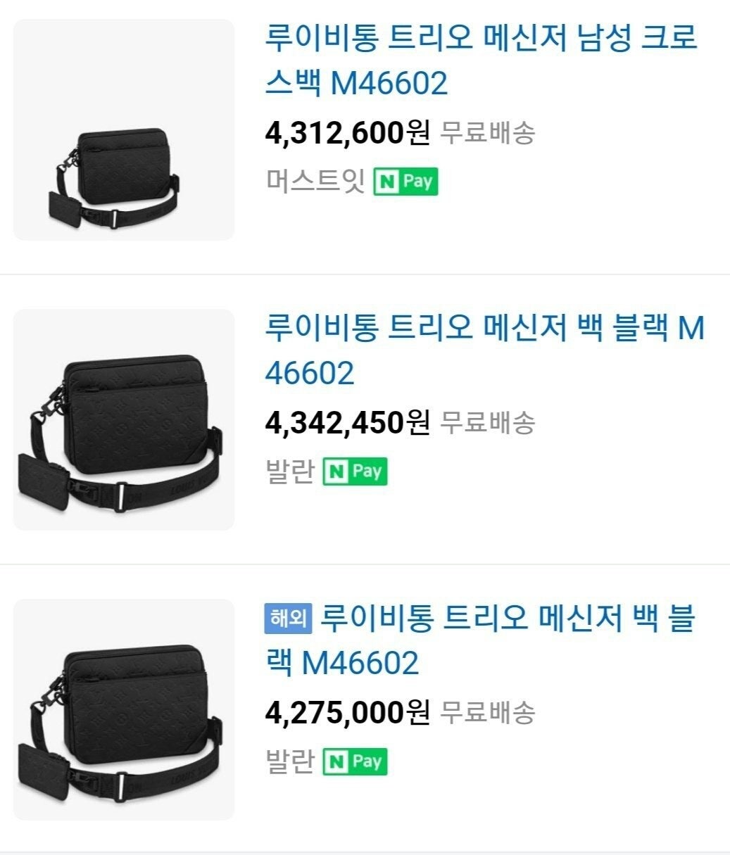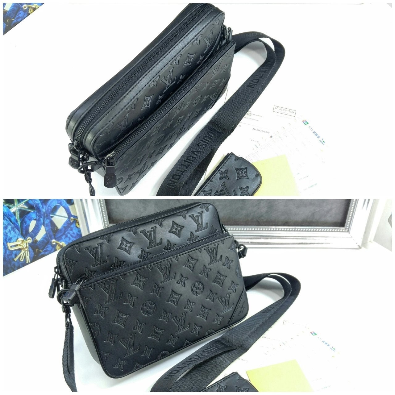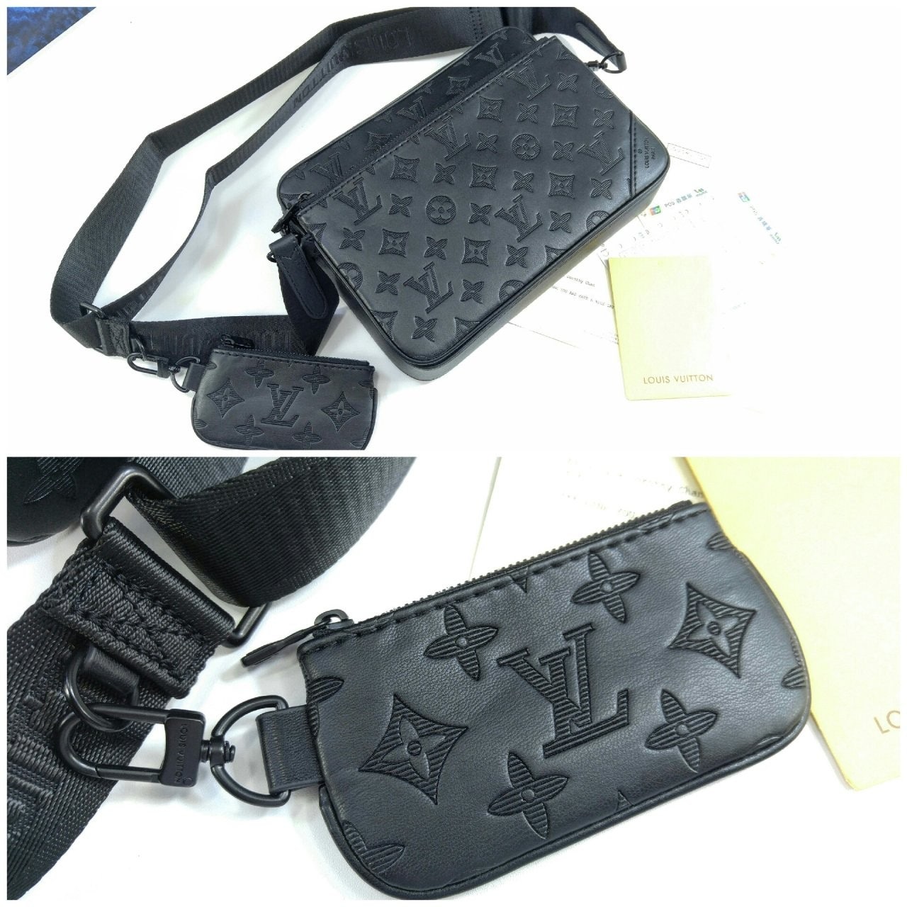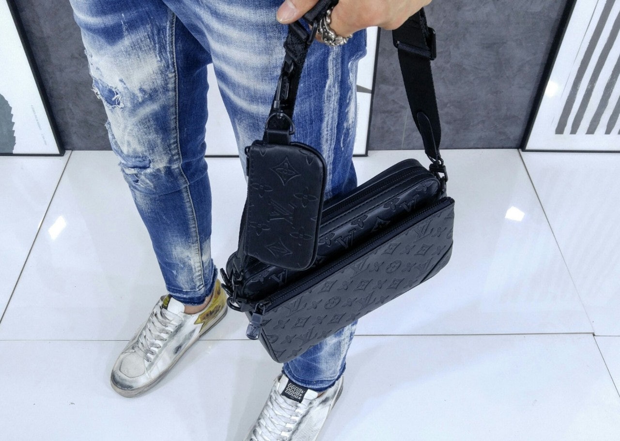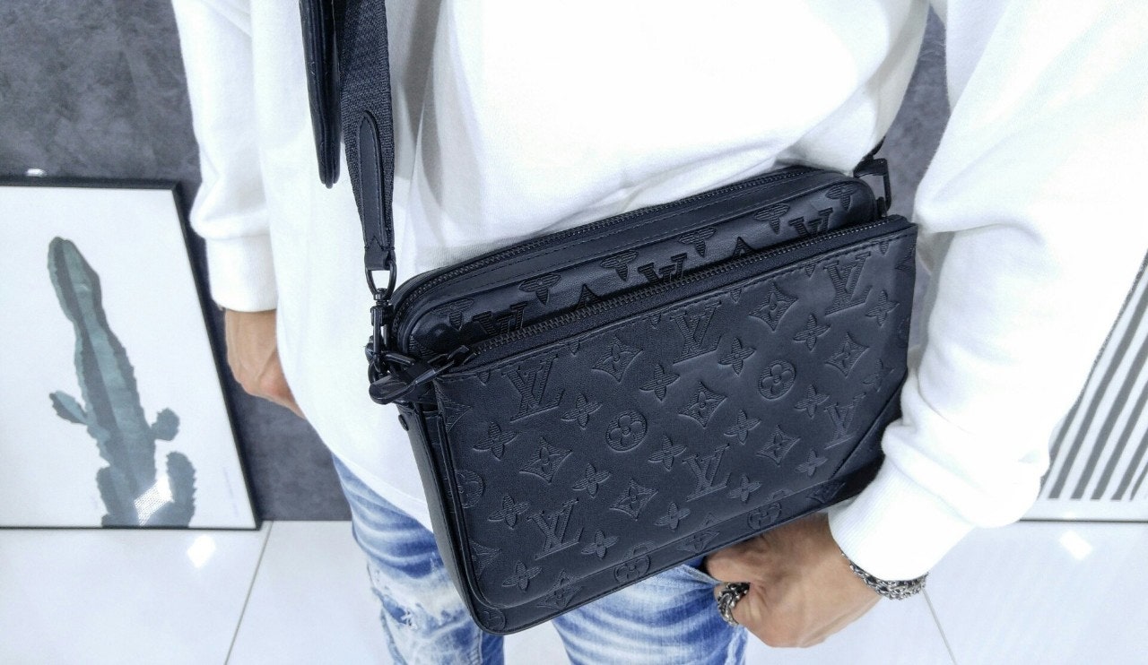 모노그램을 양각으로 새긴 송아지 가죽 소재의 트리오 메신저. 스타일리시한 하이브리드 백. 메인 수납 공간, 탈착 가능한 앞면 지퍼형 포켓과 스트랩에 달린 작은 탈착형 코인 퍼스가 특징. '루이 비□'이 새겨진 자카드 스타일 소재의 조절 및 탈착 가능한 스트랩을 구성하여 크로스 바디 백 또는 숄더 백으로 연출할 수 있는 아이템.