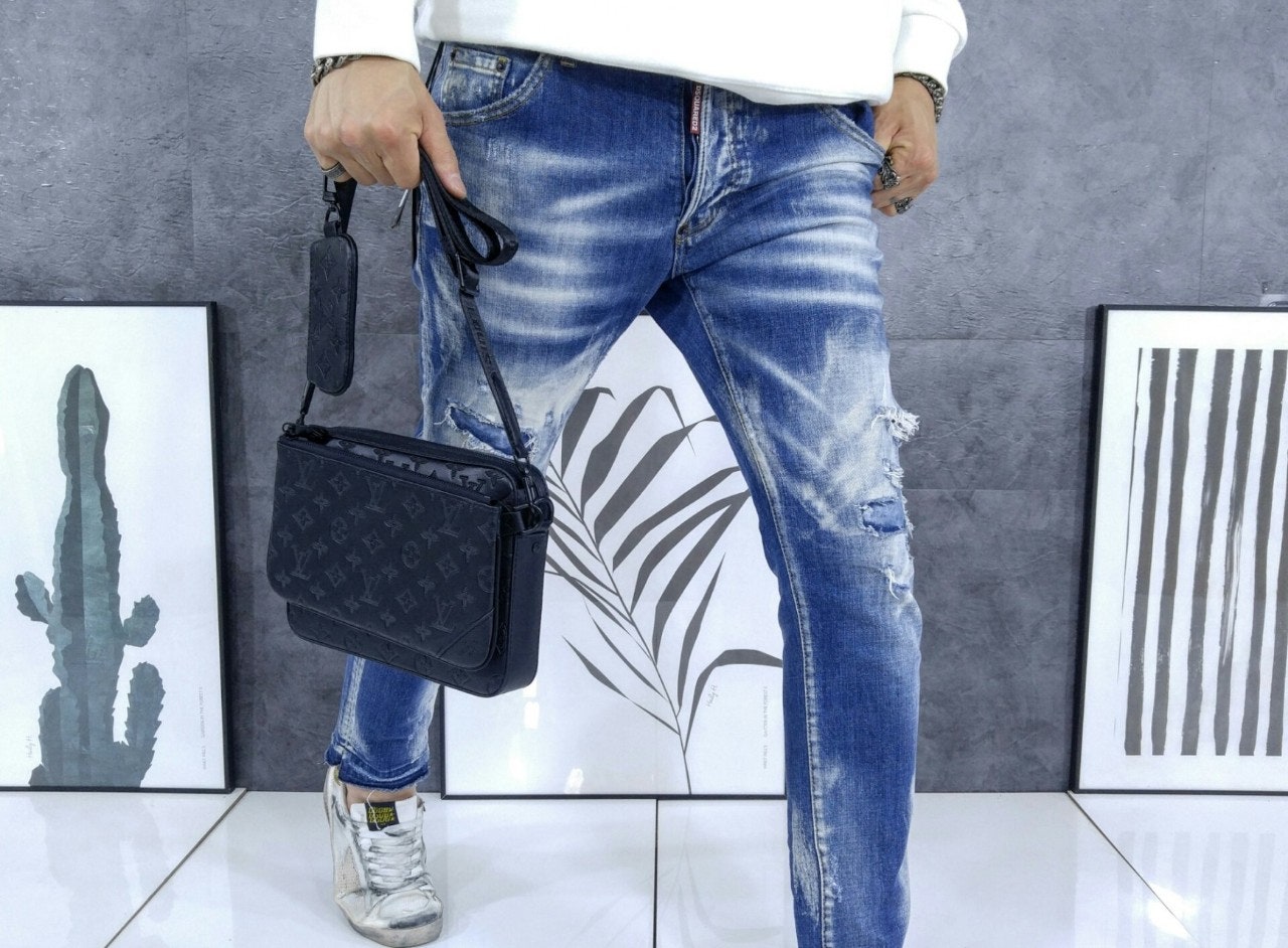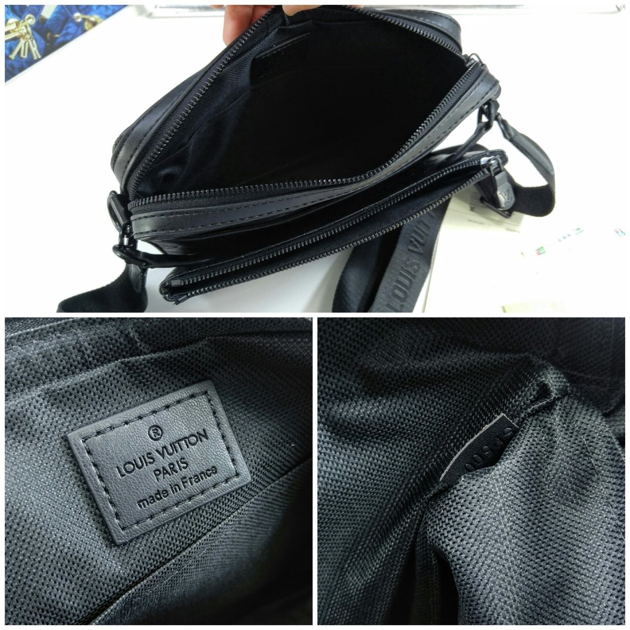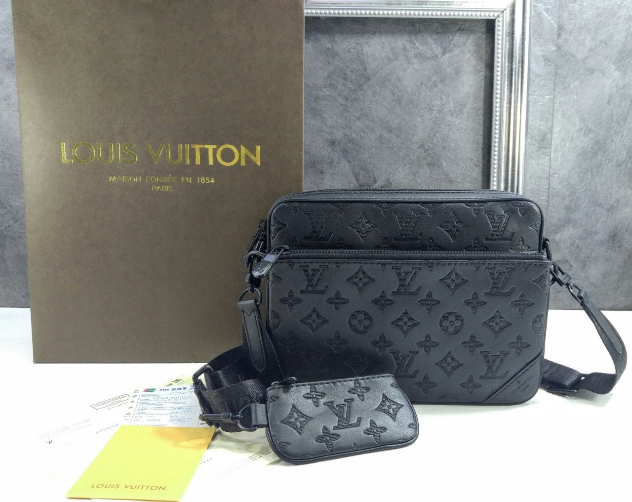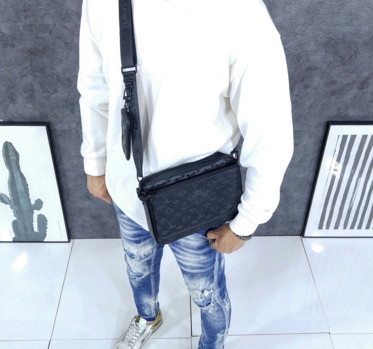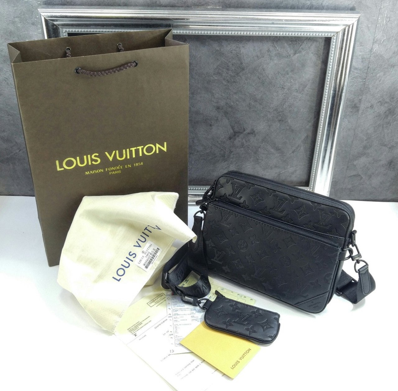 모노그램을 양각으로 새긴 송아지 가죽 소재의 트리오 메신저. 스타일리시한 하이브리드 백. 메인 수납 공간, 탈착 가능한 앞면 지퍼형 포켓과 스트랩에 달린 작은 탈착형 코인 퍼스가 특징. '루이 비□'이 새겨진 자카드 스타일 소재의 조절 및 탈착 가능한 스트랩을 구성하여 크로스 바디 백 또는 숄더 백으로 연출할 수 있는 아이템.