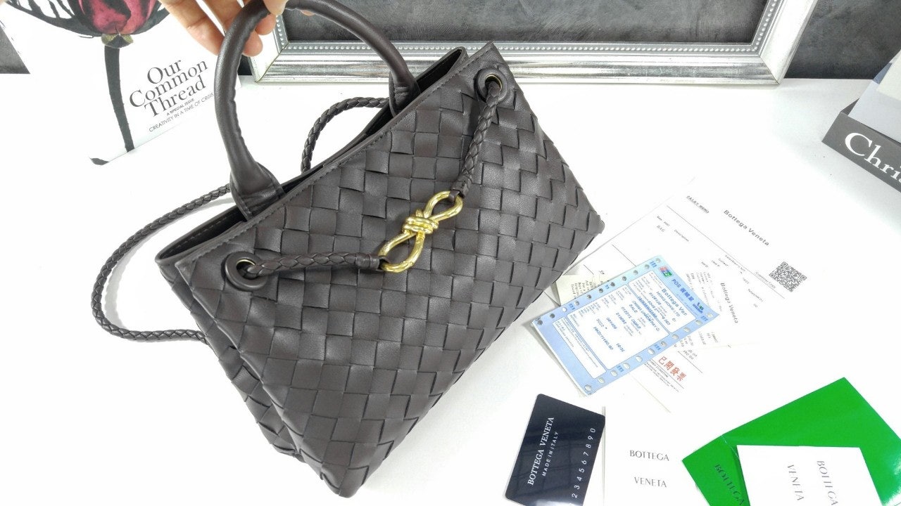 시그니처 놋 디테일 및 슬라이딩 크로스 스트랩을 갖춘 유연한 인트레치아토 가죽 소재의 긴 실루엣을 가진 탑 핸들 백.